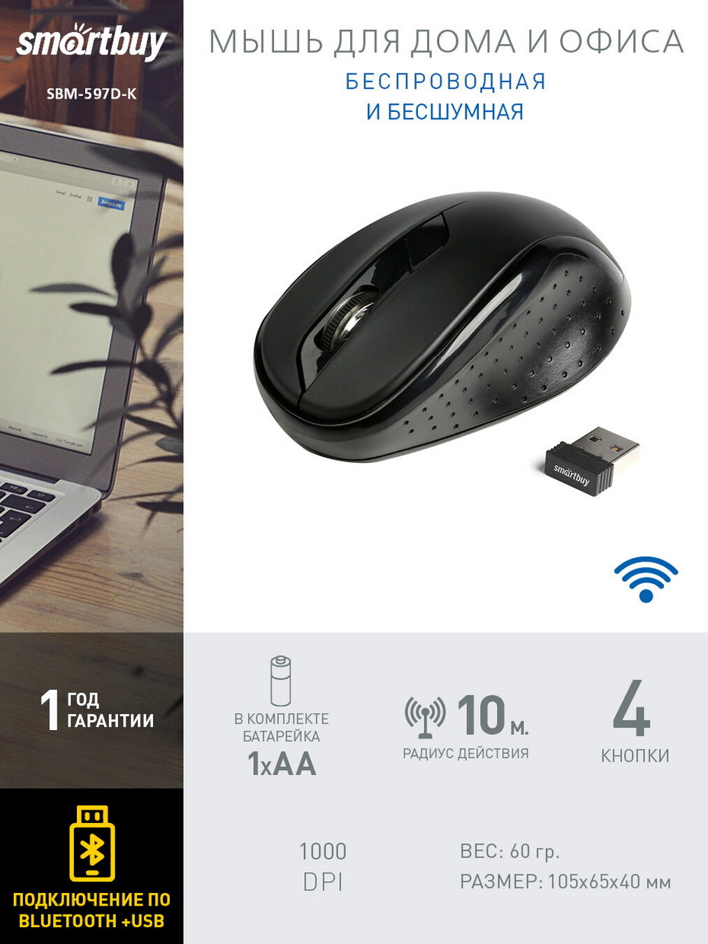 Мышь беспроводная Dual Bluetooth+USB Smartbuy SBM-597D-K черная (SBM-597D-K)/40/