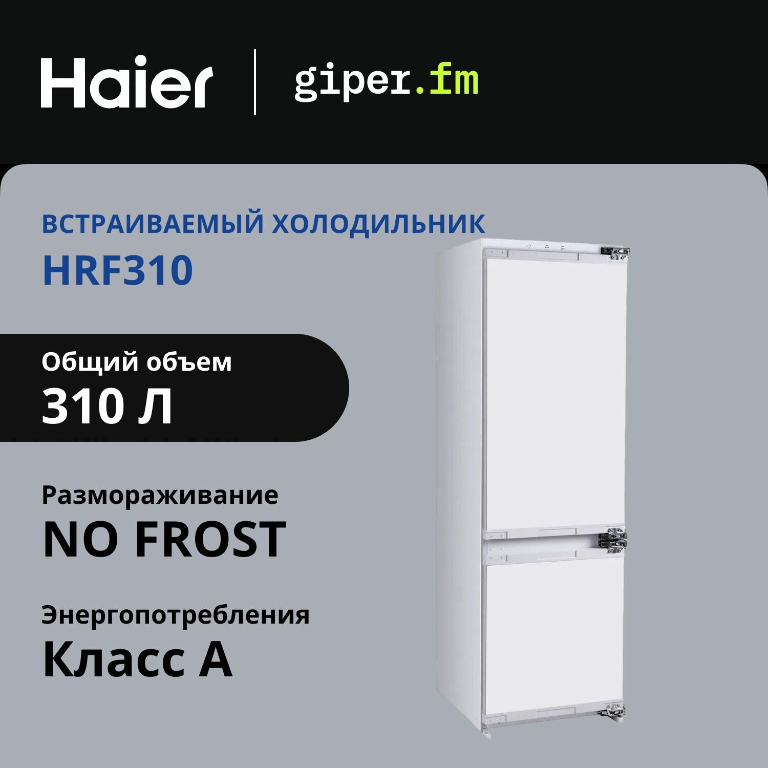 Холодильник Haier HRF310WBRU двухкамерный, встраиваемый, класс энергоэффективности A, объем 310 л, суперзамораживание и суперохлаждение, инверторный мотор, белый