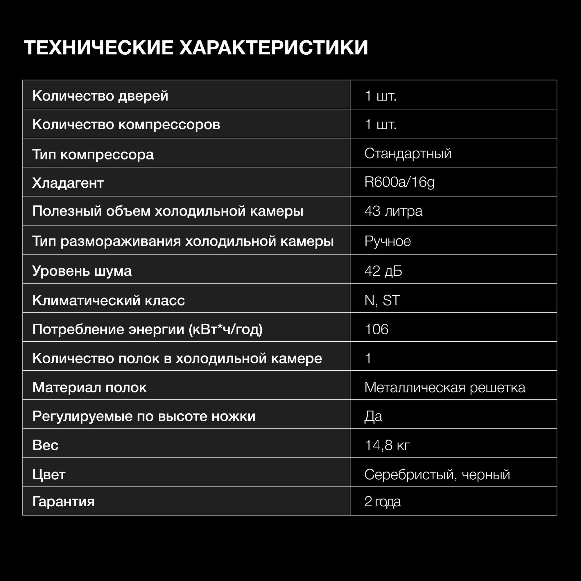 | Плюсы: | Однокамерный малогабаритный холодильник который вмещает 48 литров, потребляет немного электричества, электромеханическое управление параметрами. |