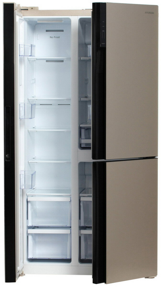 Холодильник двухкамерный Side by Side HYUNDAI CS6073FV, NoFrost Инвертор, Объем 619 л, Класс A+, управление Сенсорное с Дисплеем, Уровень шума 42 дБ, LED освещение Шампань стекло