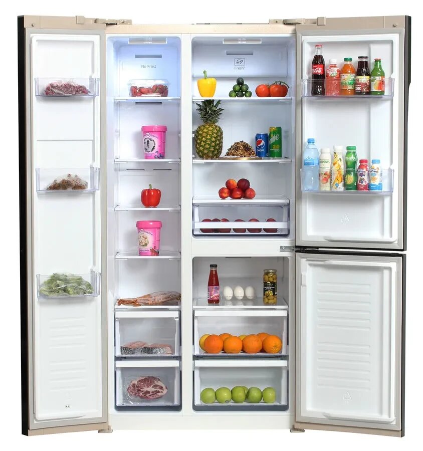 Холодильник двухкамерный Side by Side HYUNDAI CS6073FV, NoFrost Инвертор, Объем 619 л, Класс A+, управление Сенсорное с Дисплеем, Уровень шума 42 дБ, LED освещение Шампань стекло