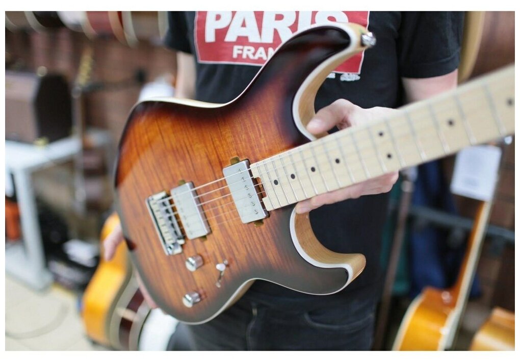 Корпус из трёх кусков, на рекламной фото из два со склейкой по центру. У бриджей край острый - без каких то закруглений. Высота струн в районе 12 лада уже миллиметра 3, настроен ли погиб грифа - непонятно в связи с этим. Мензура настроена тоже не очень, струны тянулись бесконечно. Потенциометр тона - гнутый шток, громкости - уже шуршал, наверно альфа по три юаня ведро. Джек в панели на торце болтался, гайка не затянута. Гитара была абсолютно новой, на ладах следов вообще не было. Очень большой вес, по ощущениям килограмма под 4. Датчики не хороши, глухие и мыльные. |