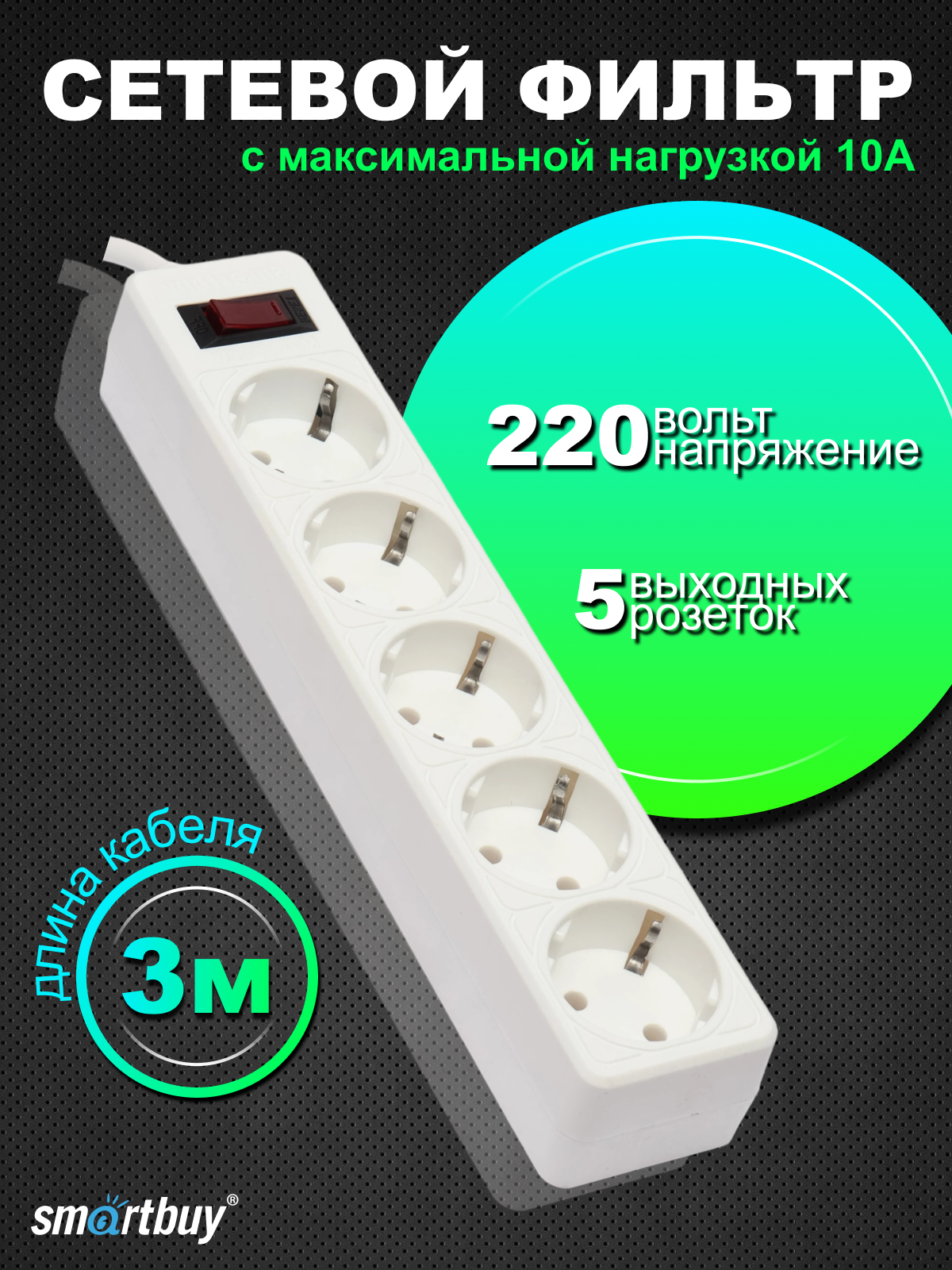 Удлинитель с функцией сетевого фильтра, 10А, 2 200 Вт, 5 розеток, длина 3,0 м, белый, Smartbuy