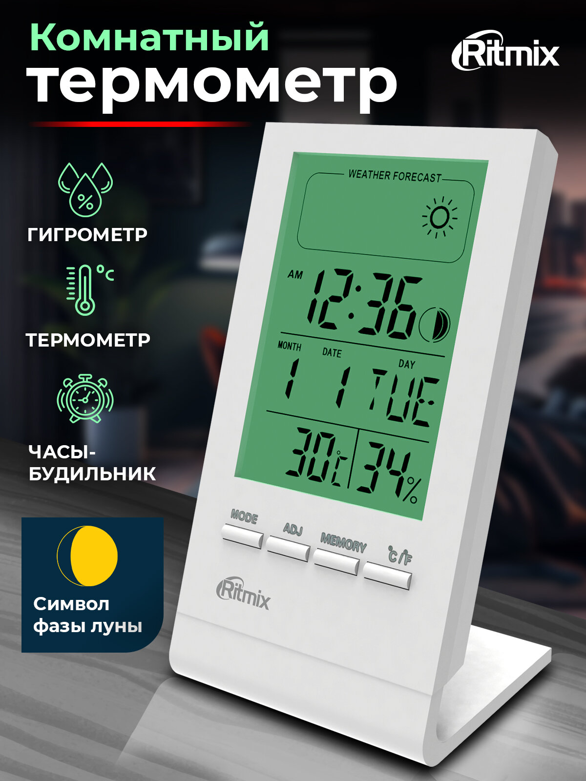 Метеостанция RITMIX CAT-040 белый, дисплей LCD, термометр комнатный, диапазон показателей температуры -50°C ..+70°C (-58°F..+158°F), гигрометр комнатный, диапазон показателей влажности 10% ..99%, электронные часы, будильник, календарь, питание от элемента