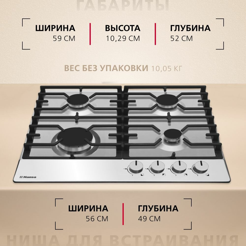 Варочная панель газовая встраиваемая Ханса BHGI610391 нержавеющая сталь 590х520х103мм 4 конфорки 2 решетки / газконтроль / электроподжиг / газовая