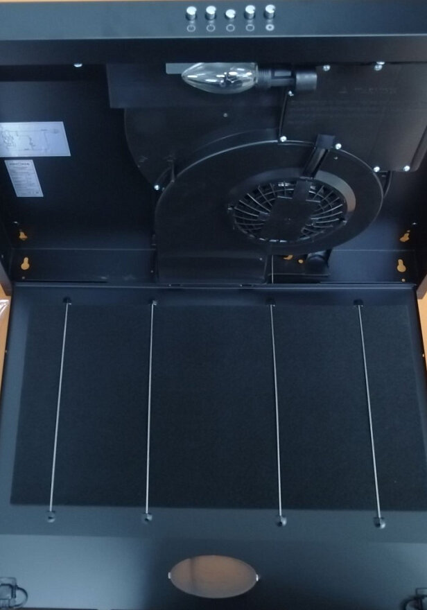 | Минусы: | По мне свет темноват, входящую в комплект лампу накаливания заменил светодиодной после установки. Жировой фильтр в виде губки, а не металлической сетки, которую можно мыть |