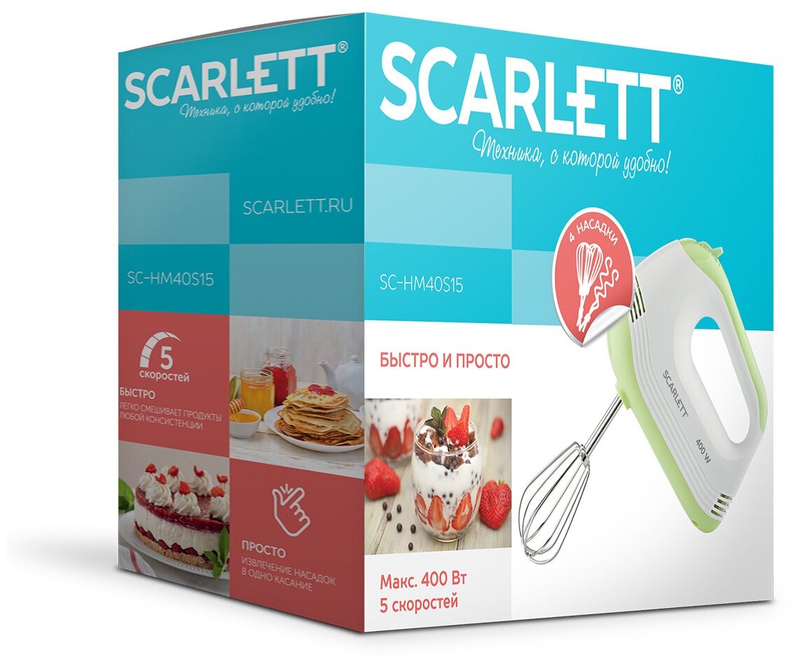 Миксер SCARLETT SC-HM40S15, 400 Вт, 5 скоростей, 2 венчика, 2 крюка для теста, белый/зеленый