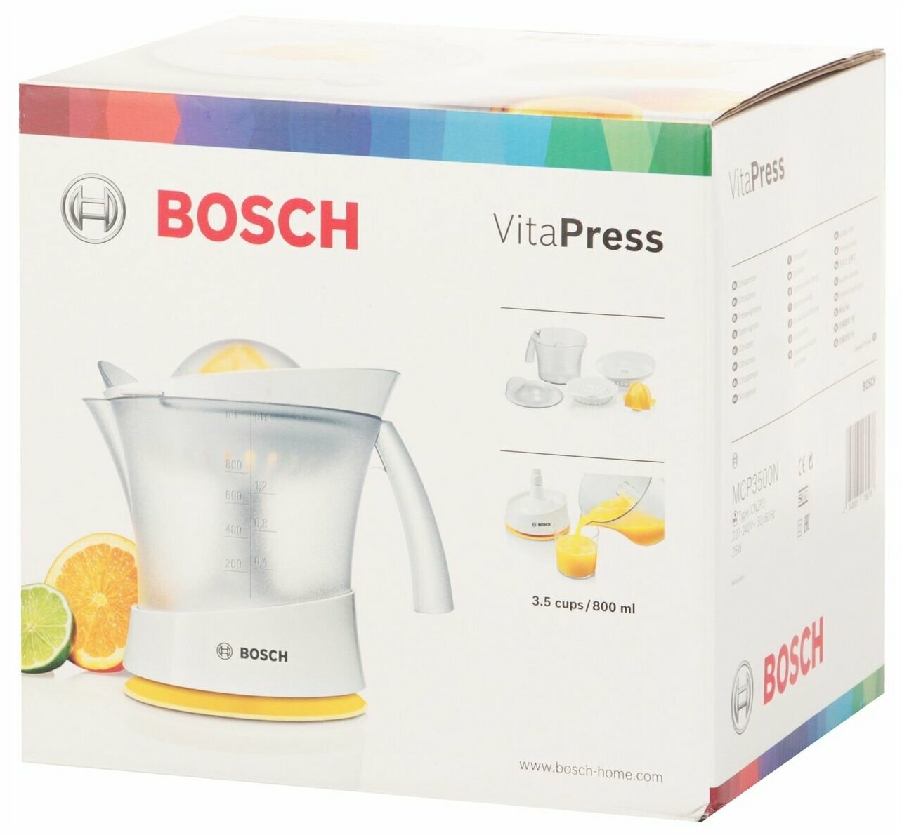Соковыжималка для цитрусовых Bosch VitaPress MCP3500N, белый, автоматическое включение, отсутствие в пластике вредных ВРА-веществ, реверс, объем 0.8 л