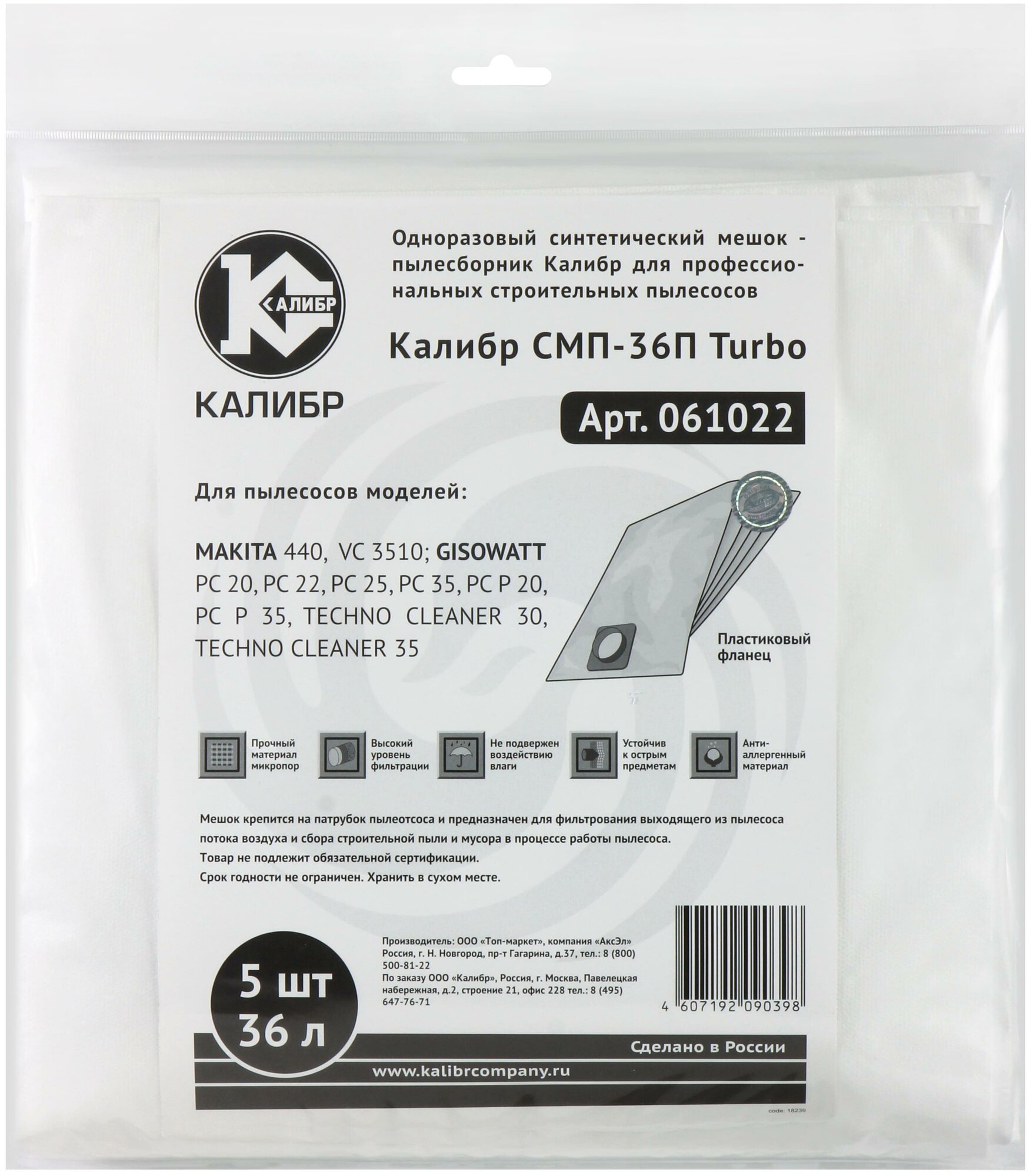 Мешки пылесборники Калибр СМП-36П Turbo для профессиональных пылесосов до 36л. 5шт.(уп) интересное: