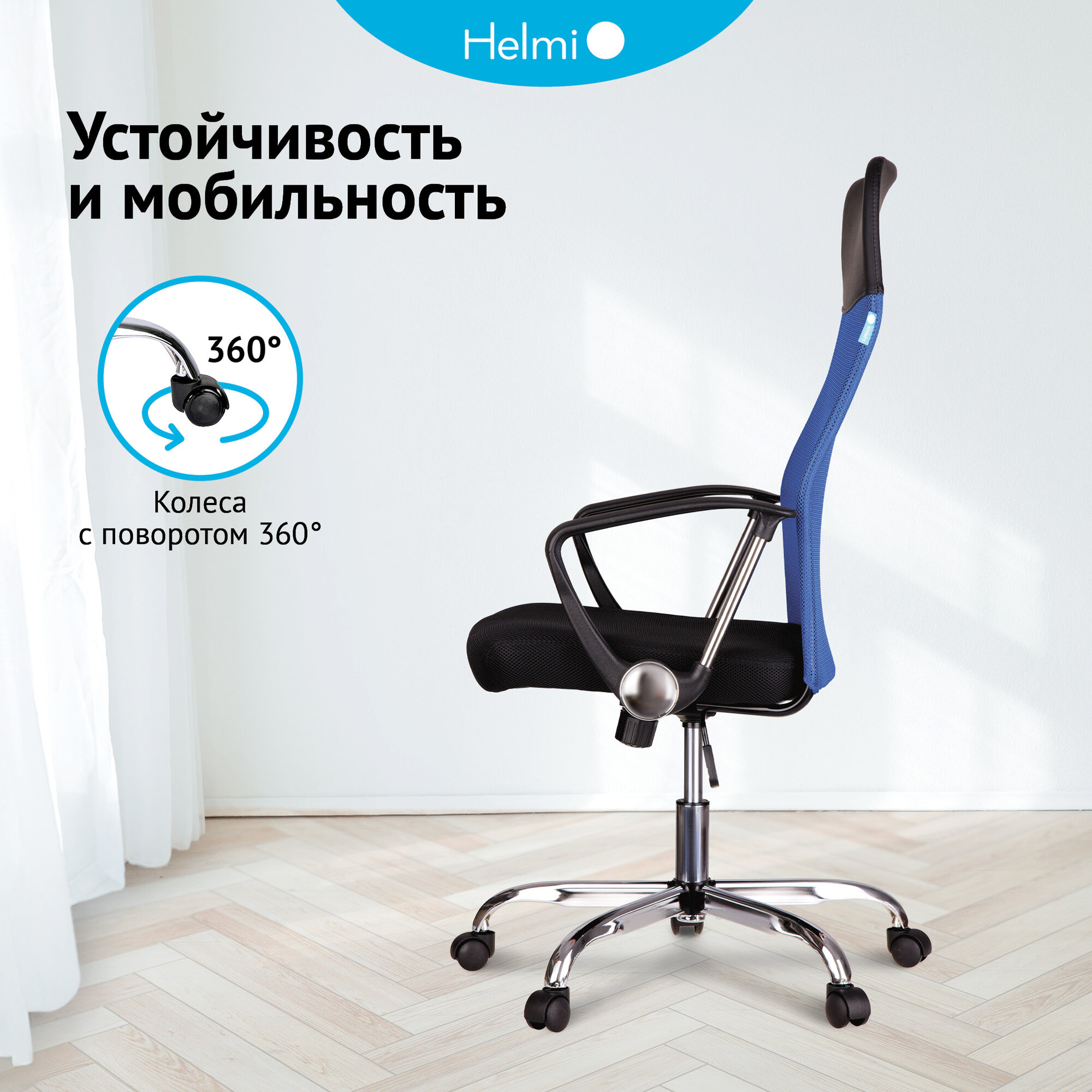 Кресло руководителя Helmi HL-E16 "Content", ткань, сетка, экокожа, черная, синяя, хром 311358