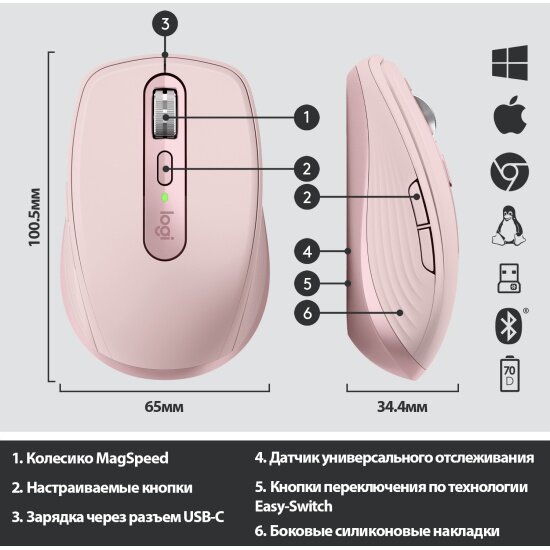 Работает на любом покрытии. Магнитное колесо прокрутки - интересная и удобная штука но требуется настройка и время чтобы привыкнуть. Много цветов на выбор. Никаких батареек - монолитный корпус с зарядкой type-C |