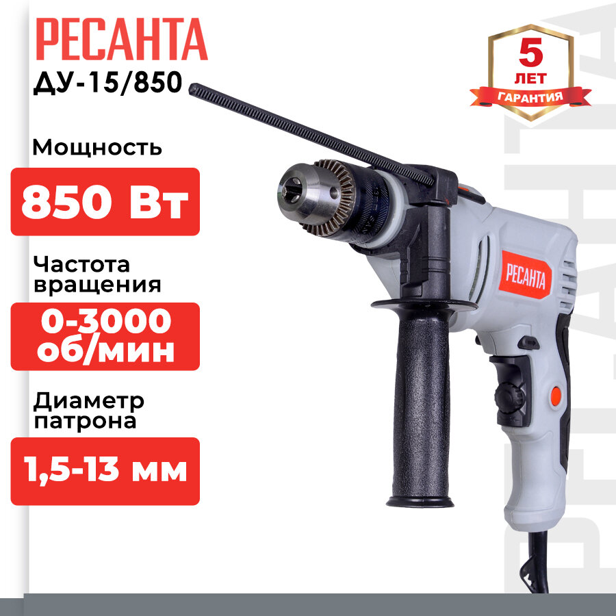 Ресанта Дрель ударная "Ресанта" ДУ-15/850, 850 Вт, ЗВП 1.5-13 мм, 3000 об/мин, реверс