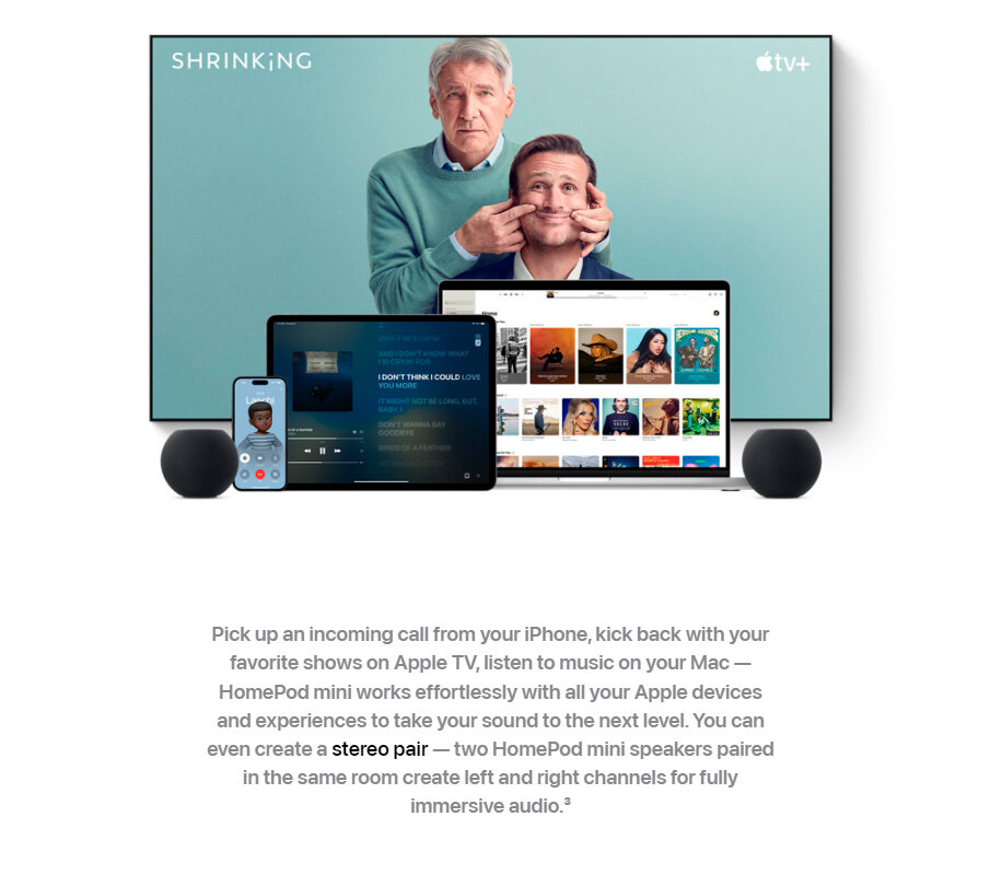 Отлично слышит из любой части гостиной и голос напрягать не надо (даже когда играет музыка) Адаптирует громкость ассистента под громкость голоса при запросе Поддерживается стереопара Можно добавить в качестве доп динамика к динамикам телевизора в AppleTV |