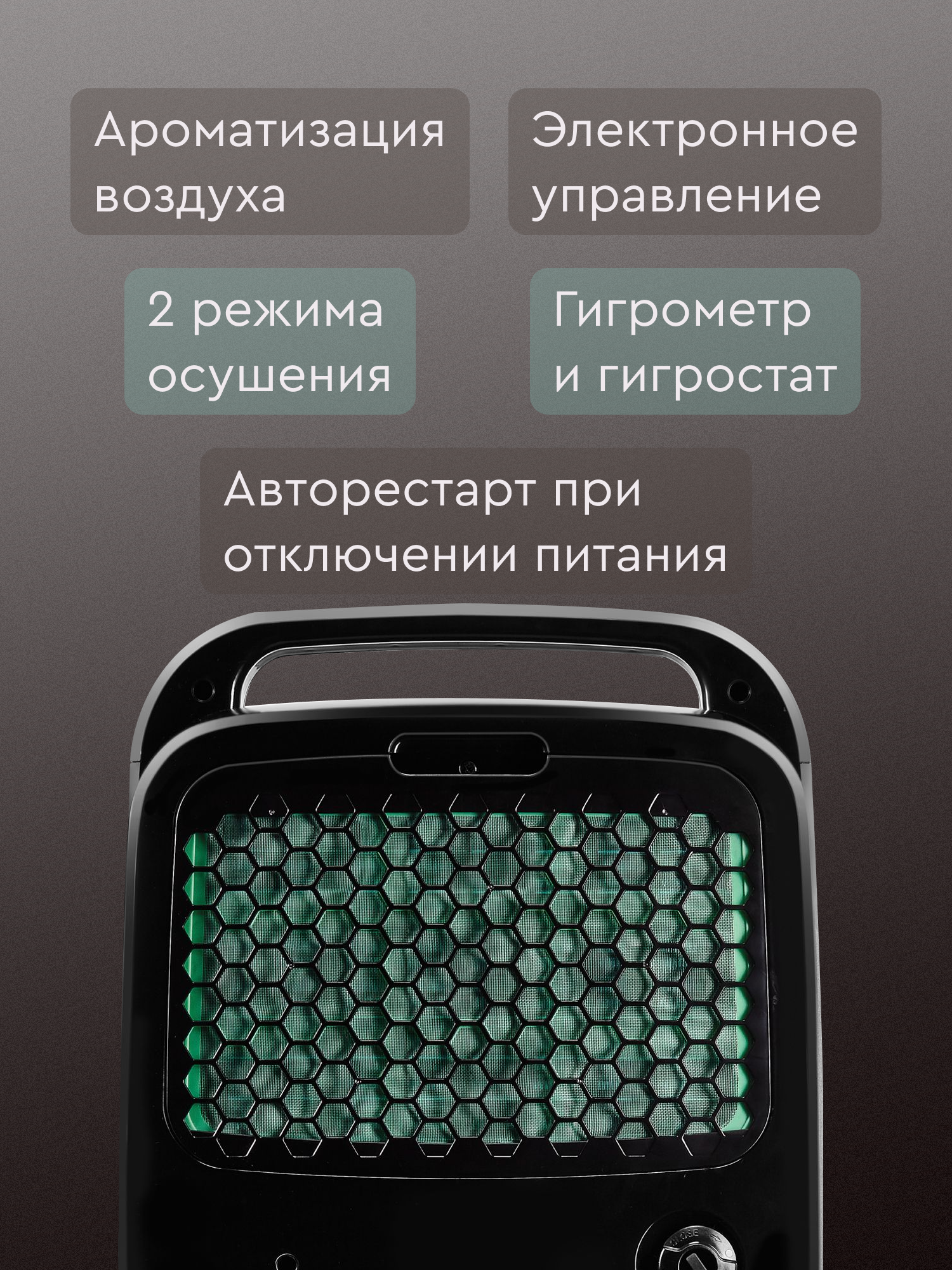 Ёмкий бачок для конденсата. Автоматическое поддержание заданного уровня влажности. Приличный дизайн. |