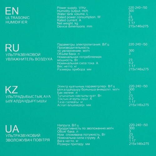| Тип увлажнителя | ультразвуковой |