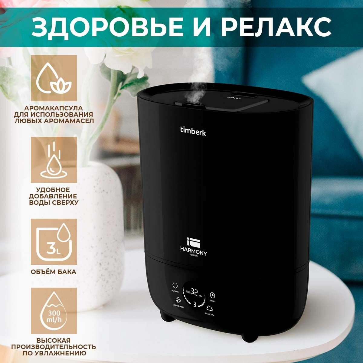 мои запросы: поддерживает влажность на нужном уровне, ставлю таймер на отключение, вода заливается сверху. Благодаря индикатору знаю какая в квартире влажность. |