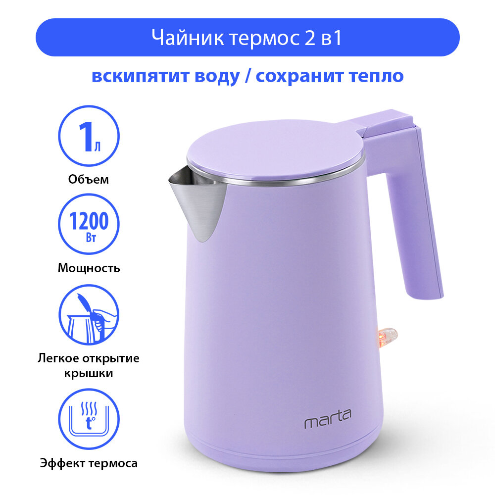 Чайник Marta MT-4591 лиловый аметист Мощность-1200W, Объем-1,0л, двойные стенки: корпус сталь 304 + .