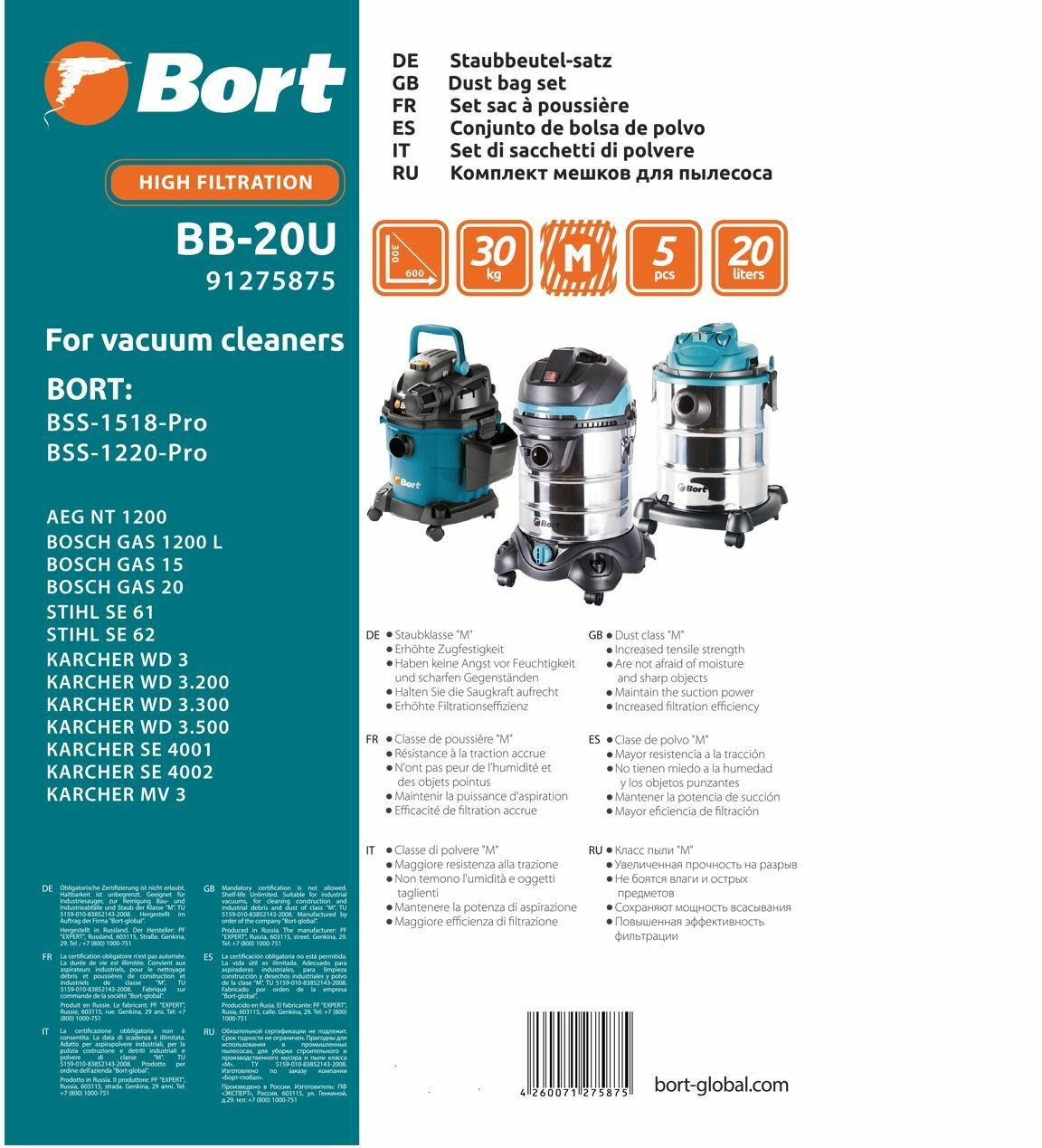 Мешок пылесборный для пылесоса Bb-20u (BSS-1518-Pro, BSS-1220-Pro), 91275875, 5 шт., 20л., Bort