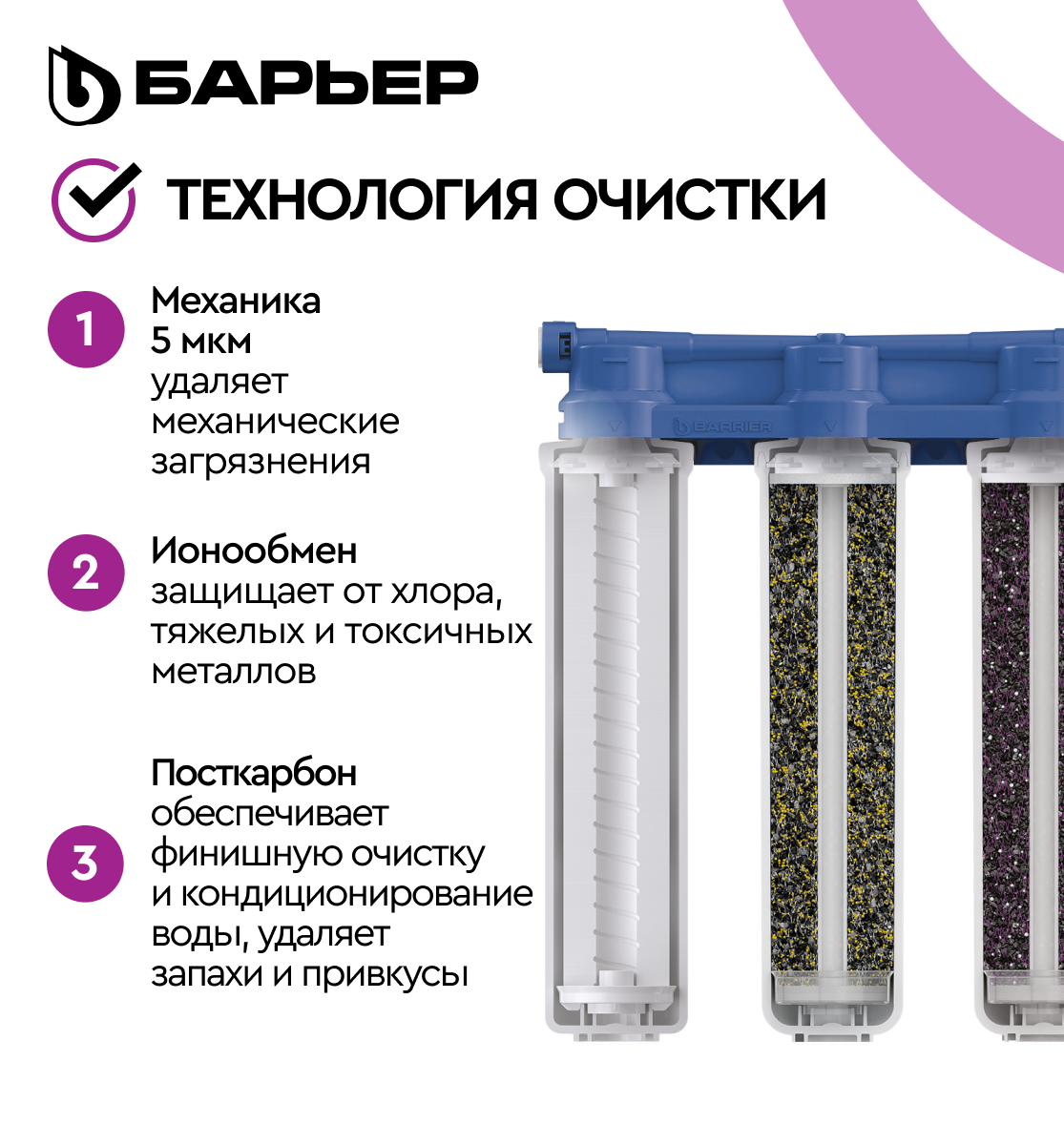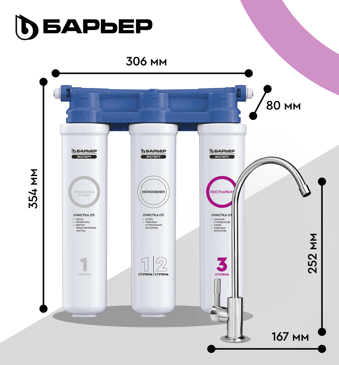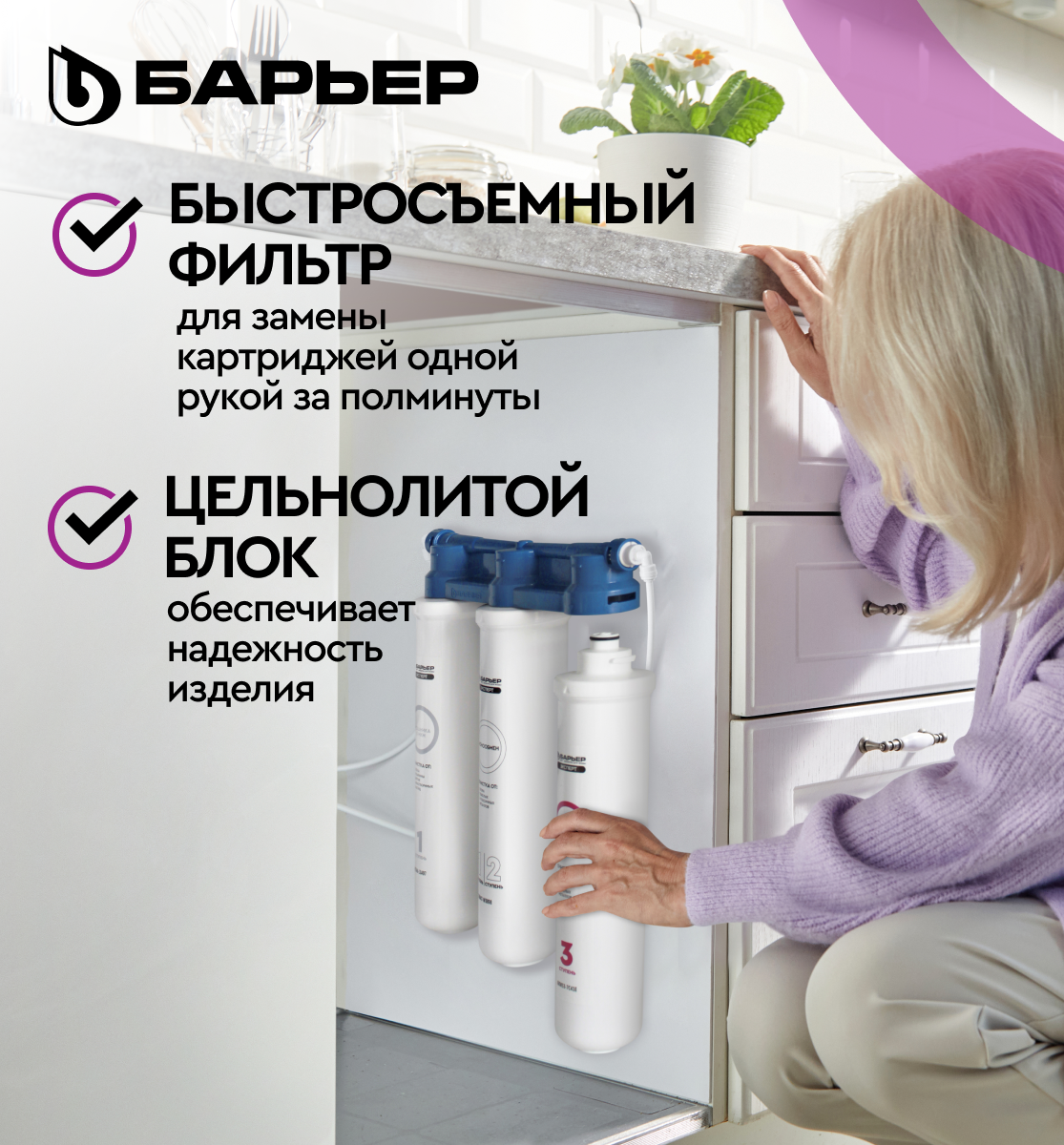 Фильтр под мойку для очистки воды трехступенчатый, быстросъемный барьер эксперт слим Стандарт защищает от хлора