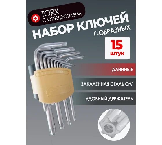 Набор ключей TORX Rock Force Г-образных, длинных, с отверстием, 15 предметов