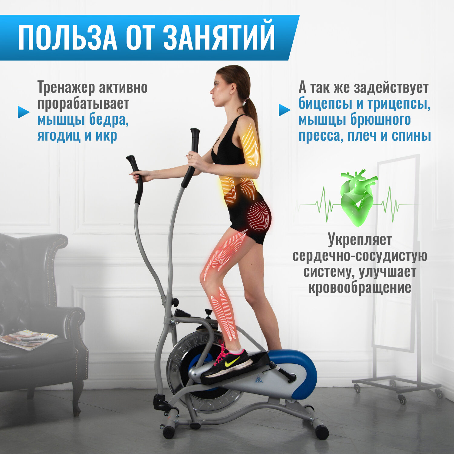 Эллиптический тренажер HyperFit Reisender U13W/3 в 1/Велотренажер/Степпет/Для дома/Для тренировок/Маховик 7 кг/магнитный