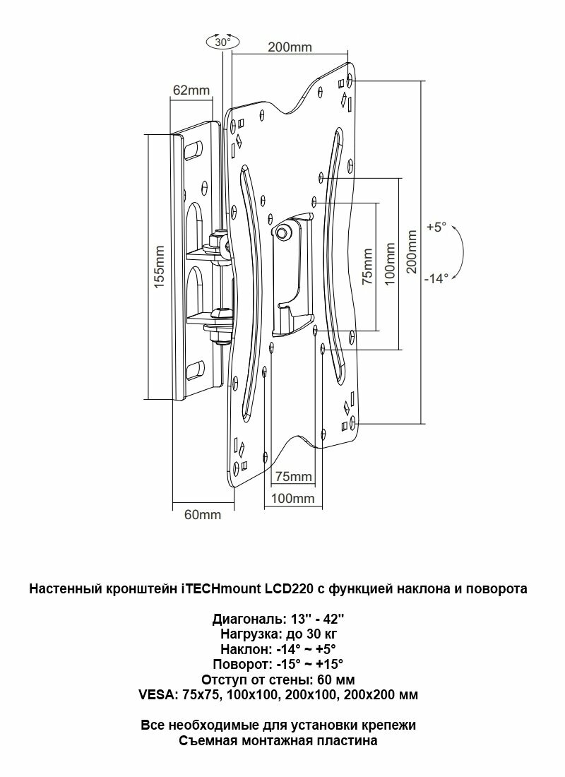 Настенный кронштейн iTECHmount LCD220 с функцией наклона и поворота