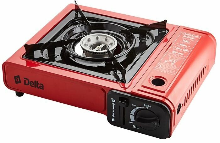 Газовая плита туристическая Дельта D-213P портативная одноконфорочная с пьезоподжигом эмалированная сталь красный 34х27.6х8.4см мощность 2.3кВт