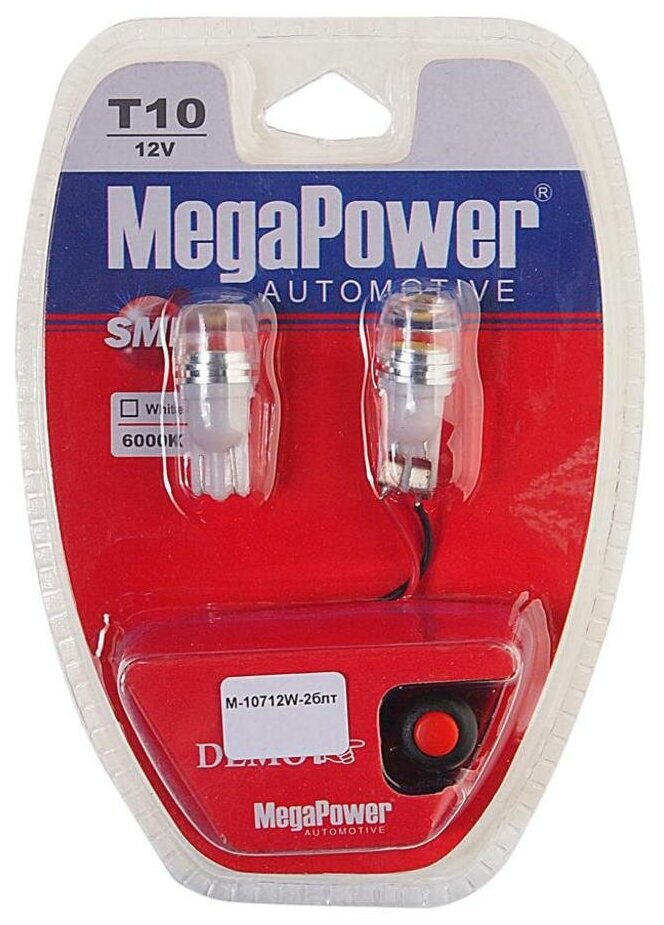 Ниже Вы можете прочитать отзывы на Лампа светодиодная 12V W5W T10W W2.1x9.5d 6000K бесцокольная блистер (2шт.) с тестером MEGAPOWER 10712W-2блт, ознакомится с подробными характеристиками, посмотреть интересные обзоры и фотографии на Лампа светодиодная 12V W5W T10W W2.1x9.5d 6000K бесцокольная блистер (2шт.) с тестером MEGAPOWER 10712W-2блт.