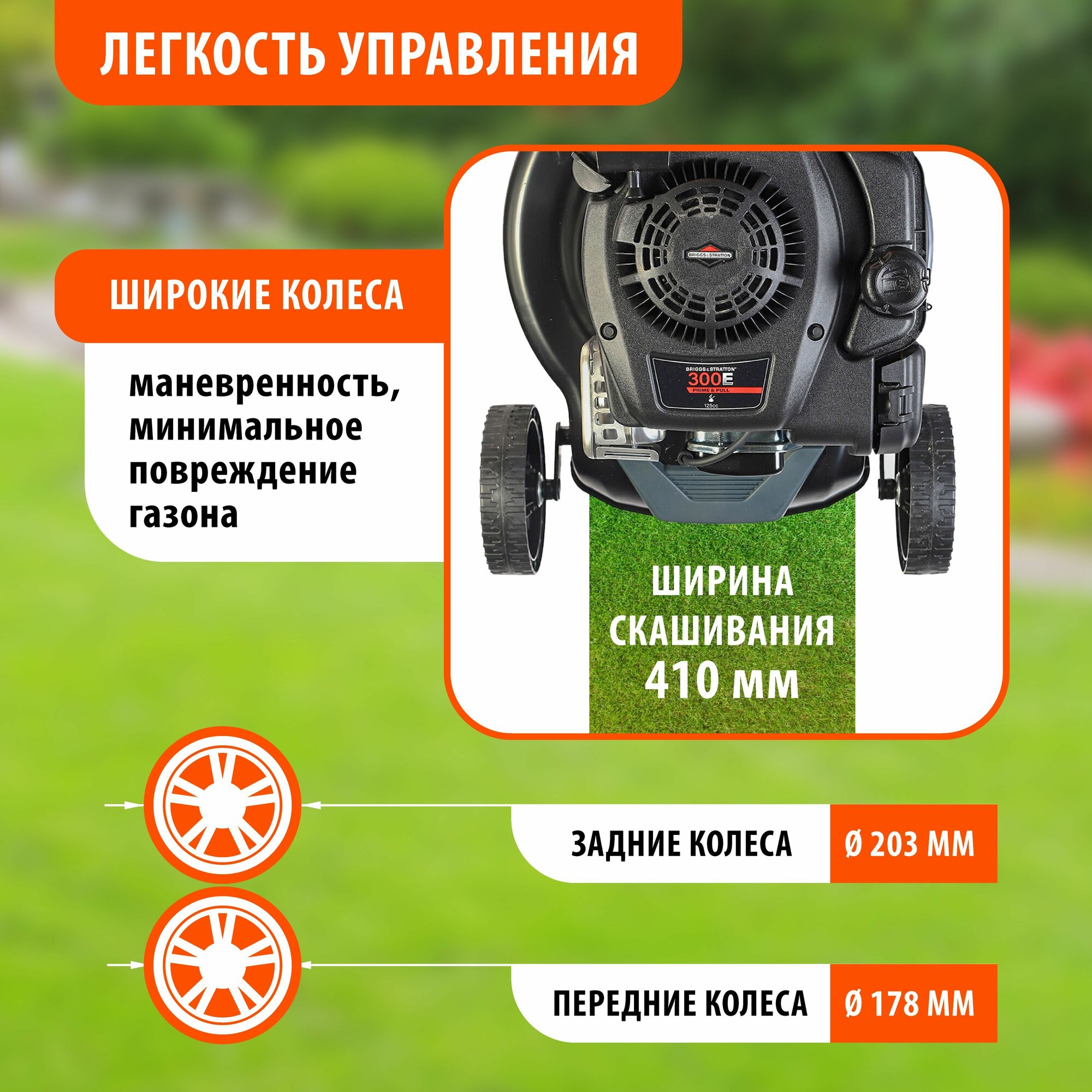 | Плюсы: | компактный, есть все необходимые режимы кроме сброса травы сбоку. Движок американец, отзывы только положительные. |