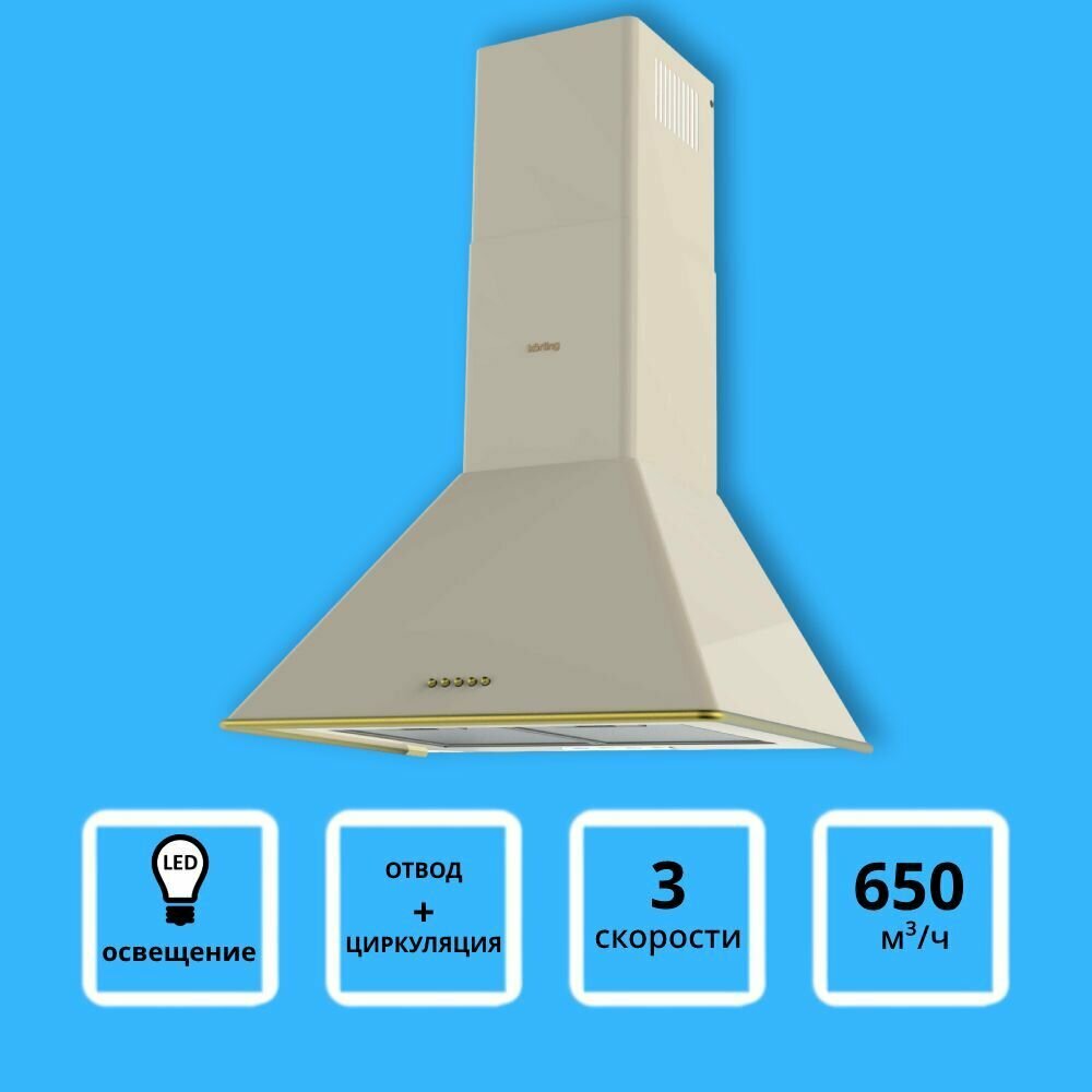 Настенная вытяжка Korting/ Кухонная вытяжка, Настенная вытяжка, Ширина 60 см, Мощность: 650 м3/ч, 3 режима, Механическое управление, Алюминиевые жировые фильтры, LED освещение, цвет - слоновая кость, профиль рамки и кнопки - золото