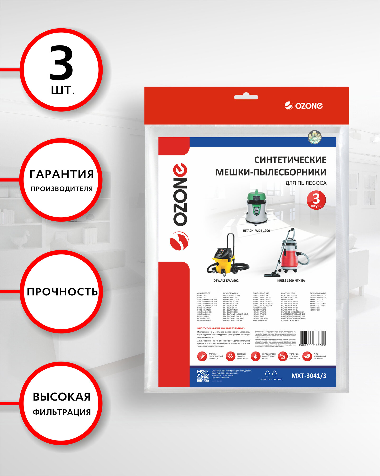 Мешки-пылесборники Ozone MXT-3041/3 3шт для Kress 1200 NTX EA/Aeg/Bosch/Dewalt/Hitachi/Nilfisk/Portotecnica/Soteco/Sparky