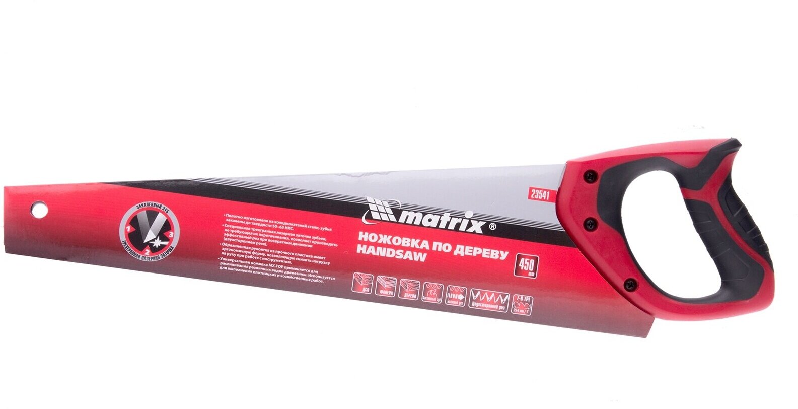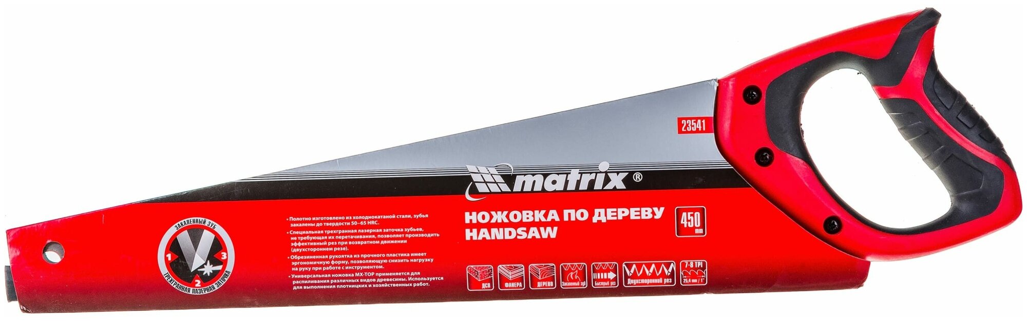 Ножовка по дереву, 450 мм, 7-8 TPI, зуб - 3D, каленый зуб, двухкомпонентная рукоятка, MATRIX 23541