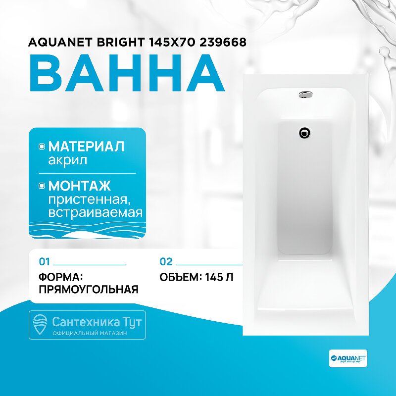Ванна акриловая AQUANET Bright 239668 145см х 70см, с каркасом