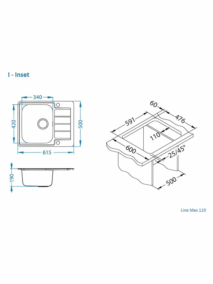 Мойка Alveus LINE 110 NAT 90 FI 615X500 в компл. с сифоном 1130551