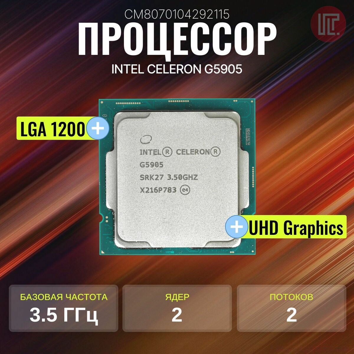 Процессор INTEL CELERON G5905 OEM (LGA 1200. 2 x 3.5 ГГц. L2 - 0.5 МБ. L3 - 4 МБ. 2хDDR4-2666 МГц. Intel UHD Graphics 610. TDP 58 Вт)