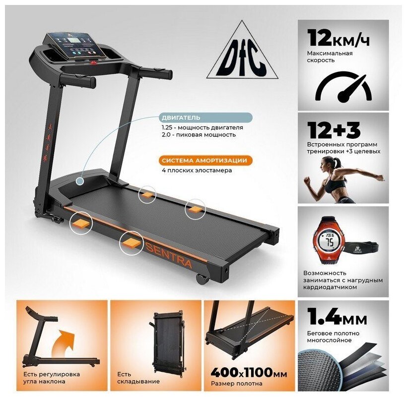 Ниже Вы можете прочитать отзывы на Беговая дорожка DFC SENTRA T123B black/orange, ознакомится с подробными характеристиками, посмотреть интересные обзоры и фотографии на Беговая дорожка DFC SENTRA T123B black/orange.