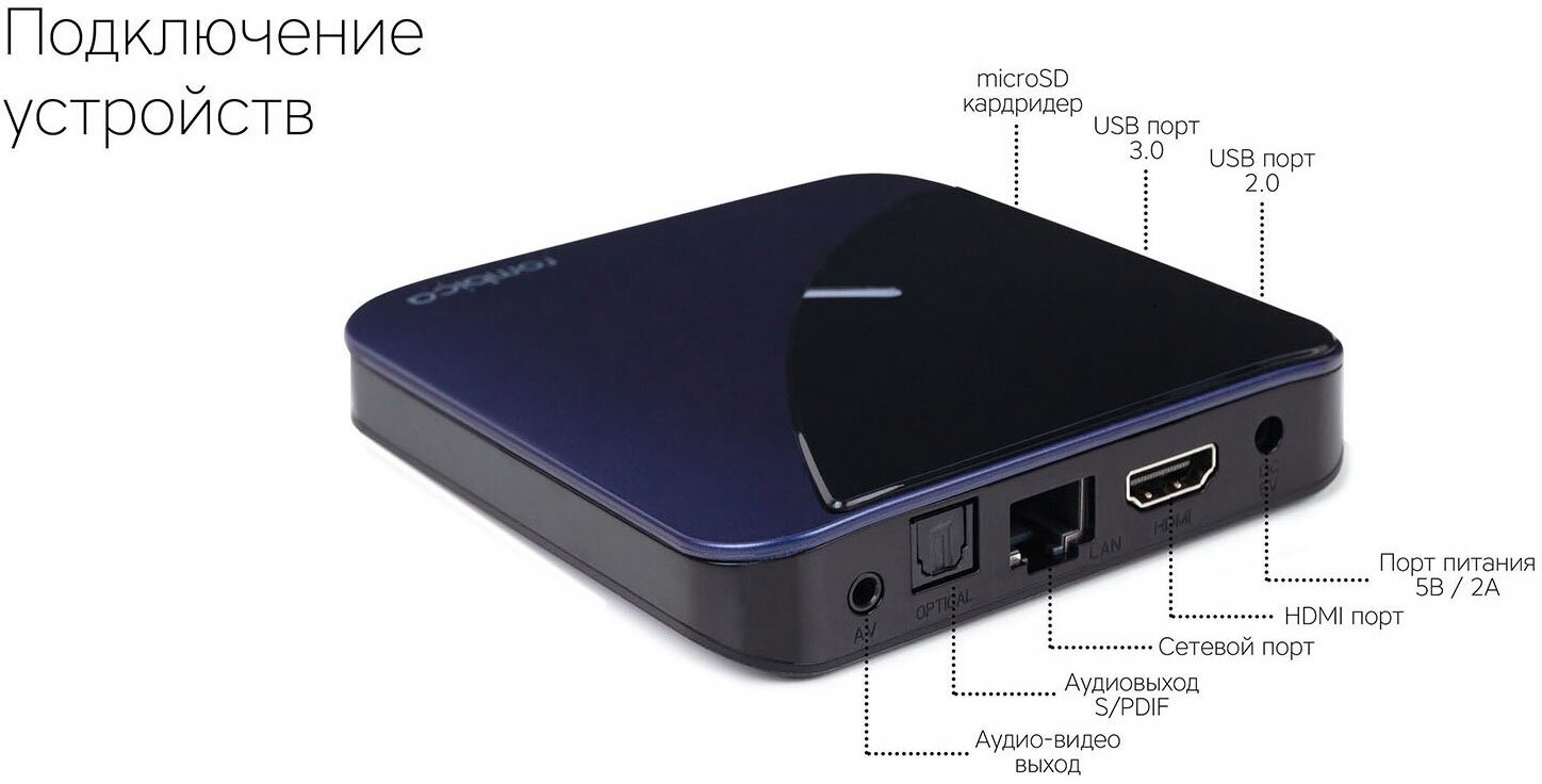 | Подробная комплектация | устройство, блок питания, пульт ДУ, кабель HDMI |