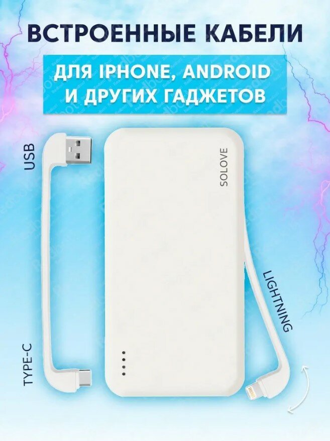 Внешний аккумулятор Power Bank SOLOVE 10000mAh Dual USB/Type-C со встроенными двумя кабелями USB/Type-C и Lightning (W7 White RUS)