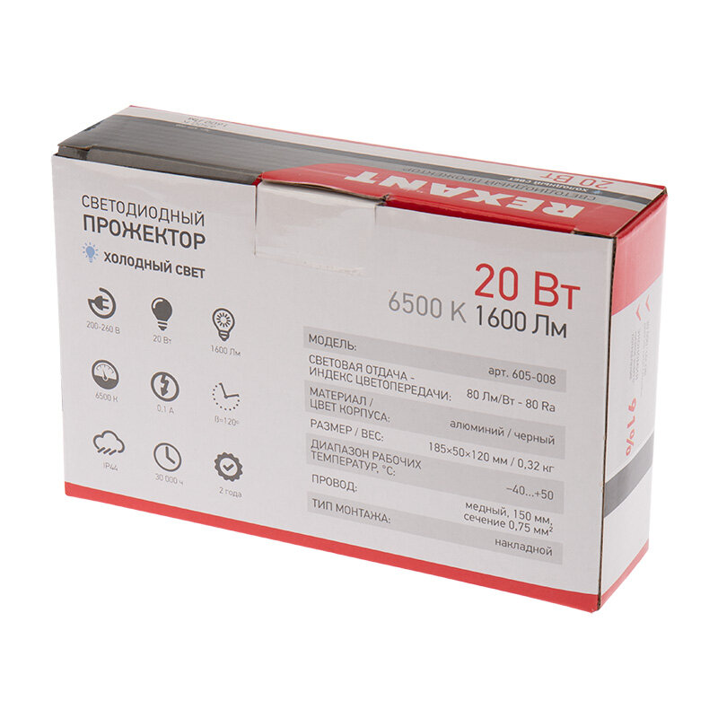 Прожектор светодиодный REXANT 605-008, 20 Вт, свет: холодный белый