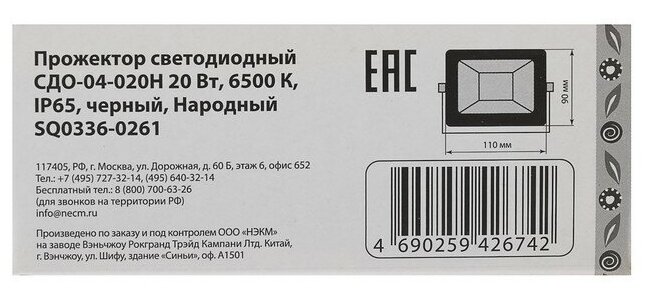 Прожектор светодиодный, TDM, Народный СДО-04-020Н, 20 Вт, 6500 К, IP65, чер, SQ0336-0261