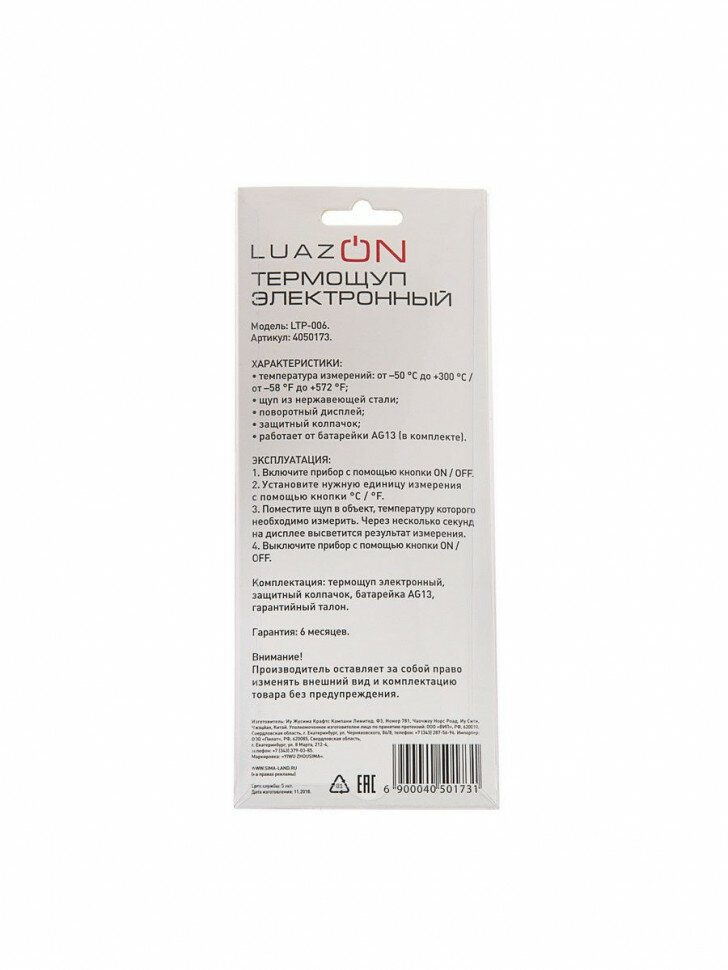 Термощупы Luazon Home Термощуп кухонный TA-288, максимальная температура 300 °C, от LR44, белый
