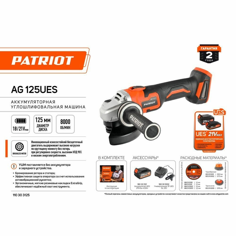 СохранитьШлифовальная машина Patriot AG 125Li UES интересное: