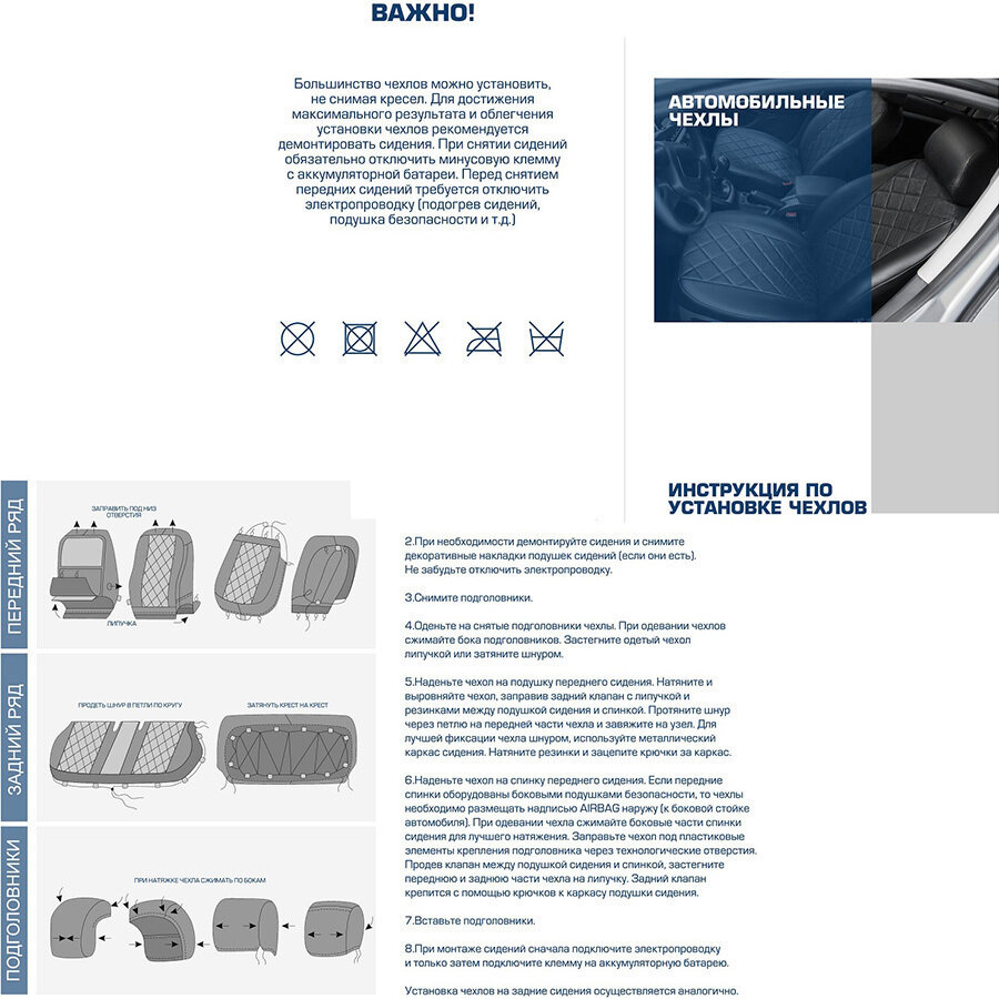 | Дополнительная информация | имеют специальный шов в передних чехлах, который не мешает срабатыванию подушки безопасности |