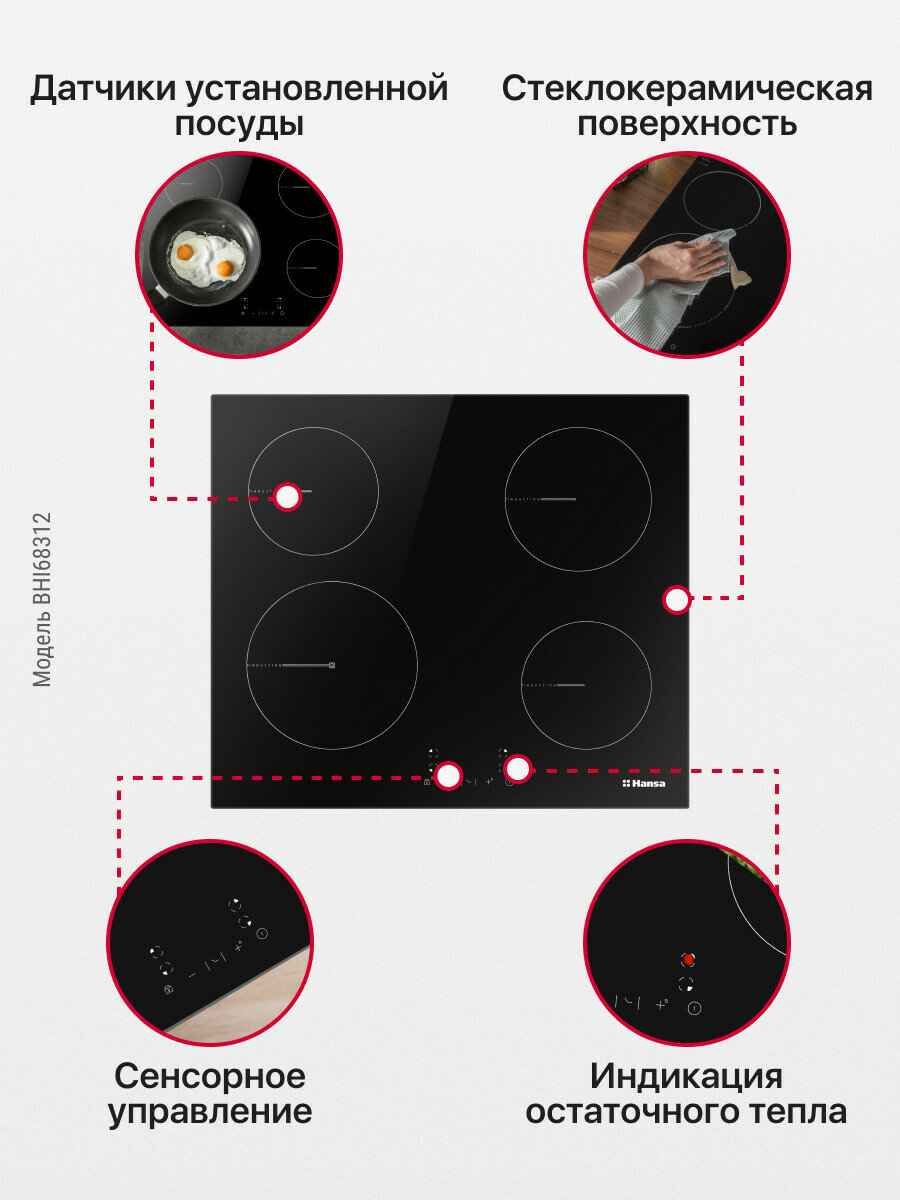 Индукционная варочная панель Hansa BHI68312, встраиваемая, 60 см, функция блокировки управления, звуковой таймер, стеклокерамическая поверхность с сенсорным управлением