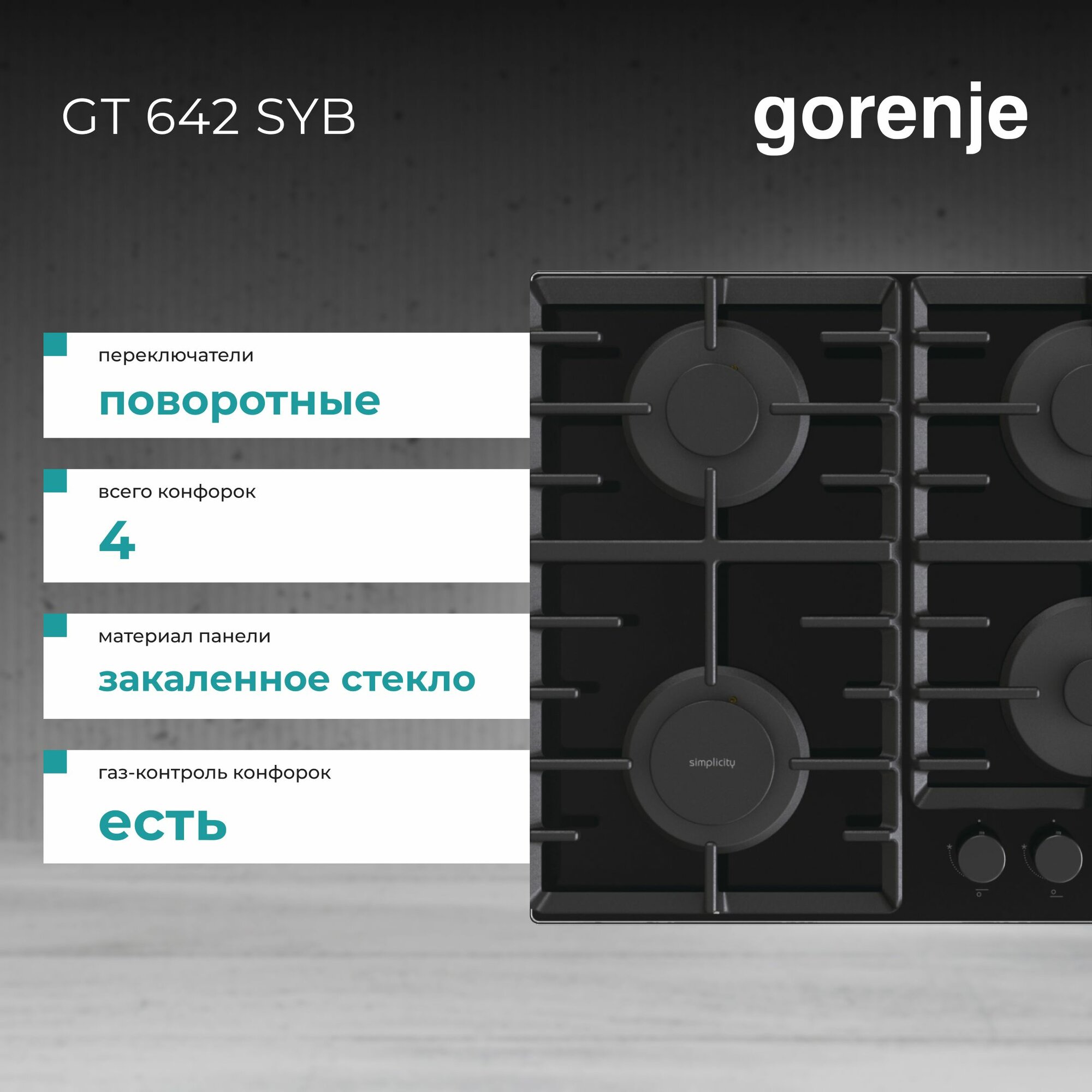 Варочная панель газовая встраиваемая Горенье GT642SYB закаленное стекло черный 600х520х136мм 4 конфорки 2 решетки / газконтроль / электроподжиг /