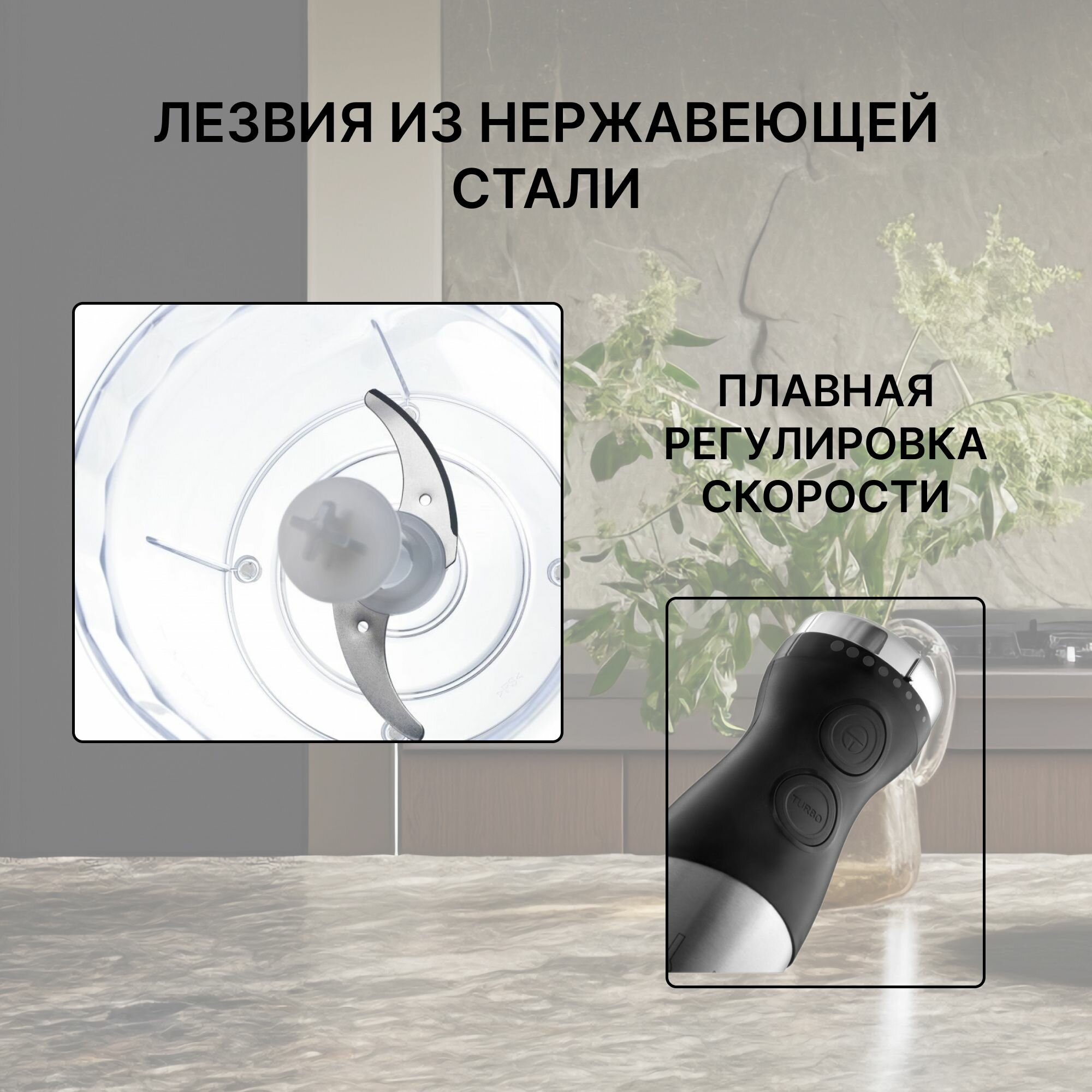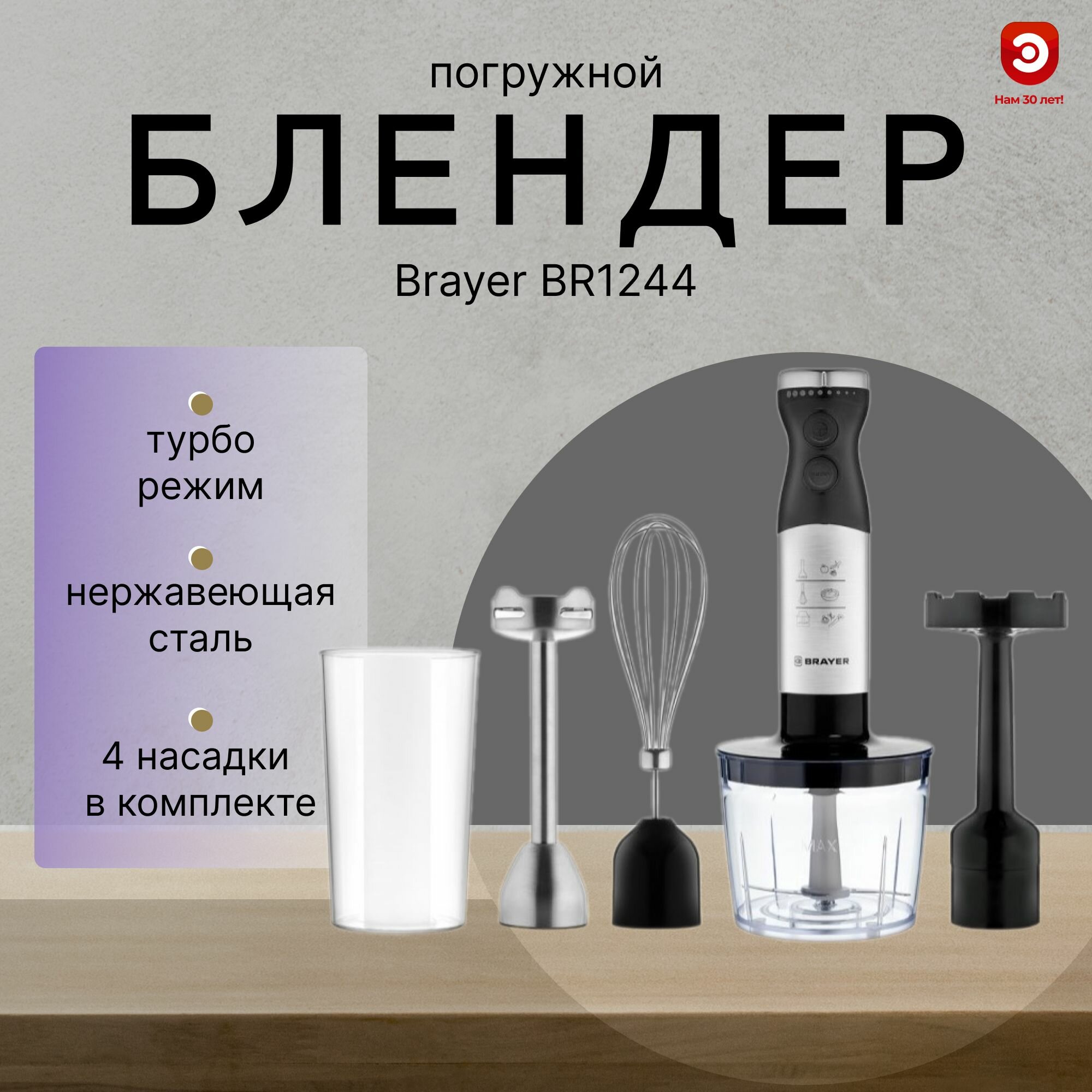 Блендер погружной Brayer 800 вт, 2 режима, измельчитель, венчик, стакан, пюре, черный (BR1244)