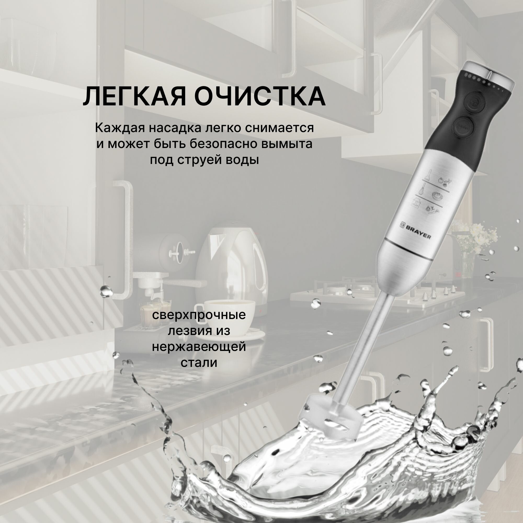 Блендер BRAYER BR1244 погружной, 800 Вт, нержавеющя сталь, 2 скорости, плавная регулировка, венчик, стаканчик 700 мл