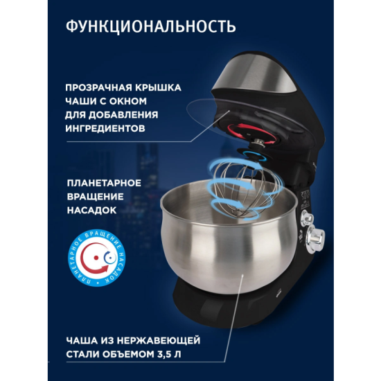 | Плюсы: | Качественный планетарный миксер, все необходимые насадки в комплекте |