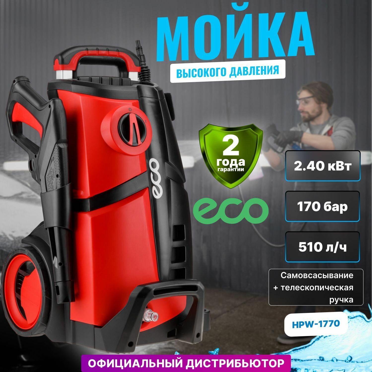 Очиститель высокого давления ECO HPW-1770 (2.40 кВт, 170 бар, 510 л/ч, самовсасывание, телескоп. ручка, активный пеногенератор) (HPW177000001)