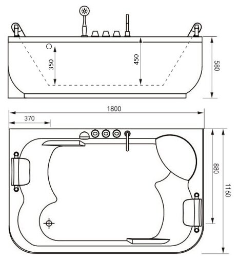 | Подробная комплектация | ванна, каркас, подголовники нет 2шт., система слива/перелива, смеситель с изливом, душевая лейка, съемная панель |
